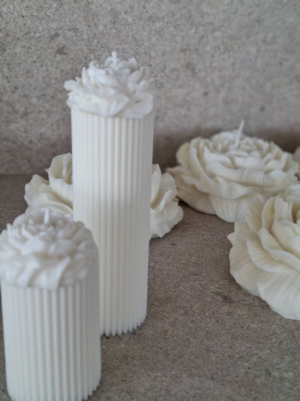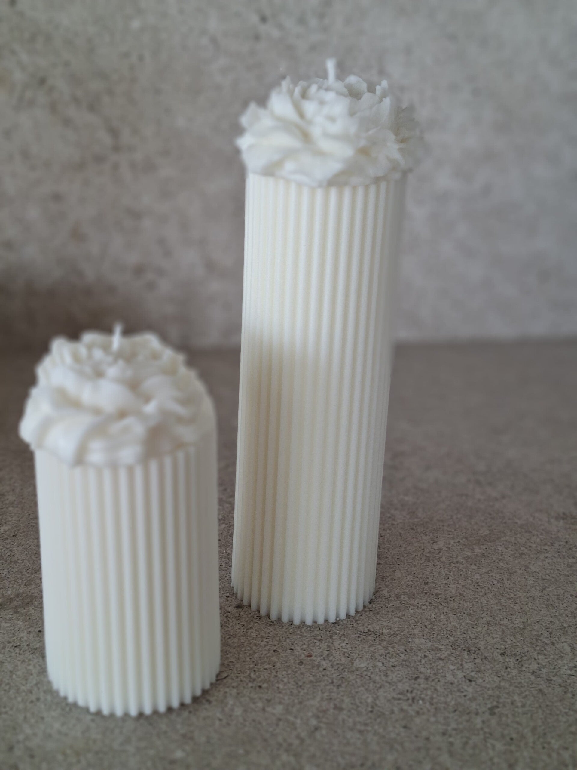 Conjunto de dis velas de rayas blancas con orquideas, una vela mas alta y otra más baja.