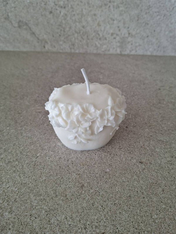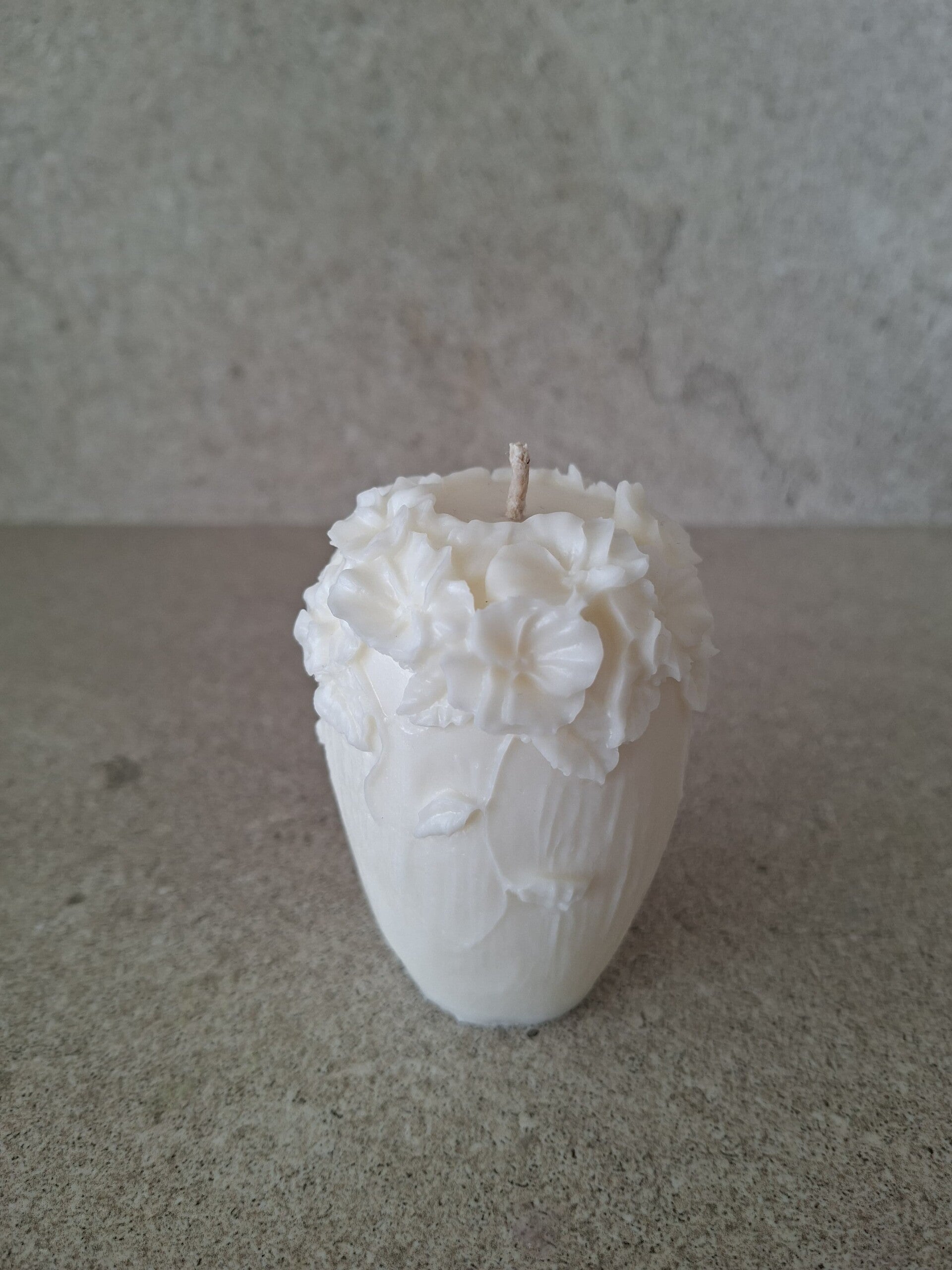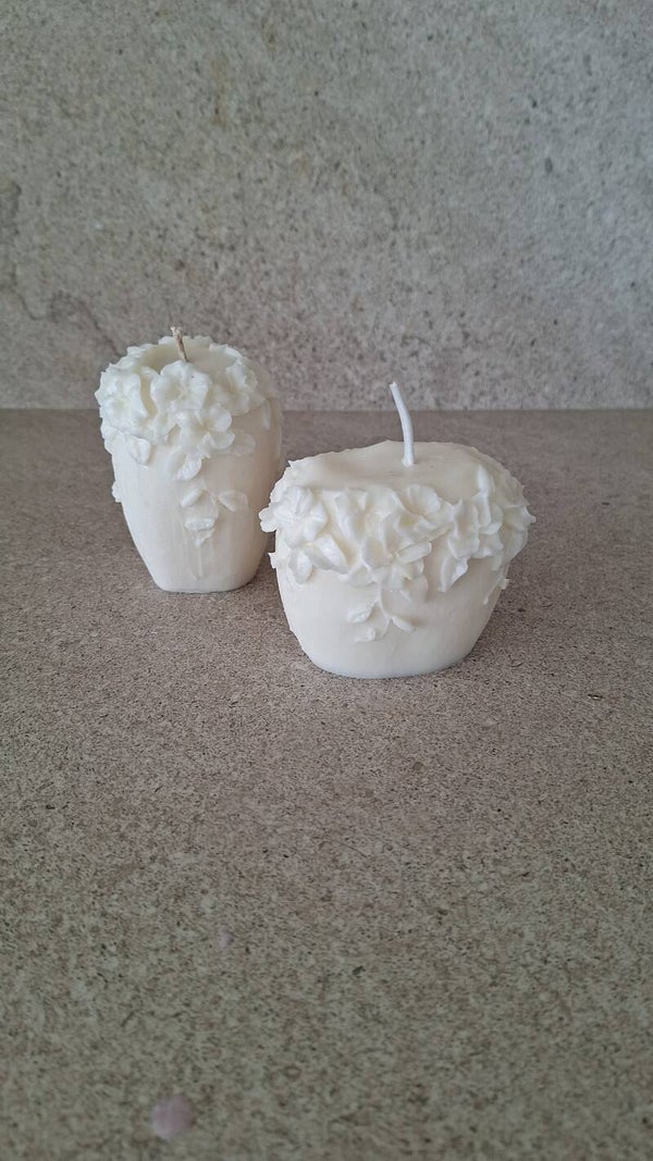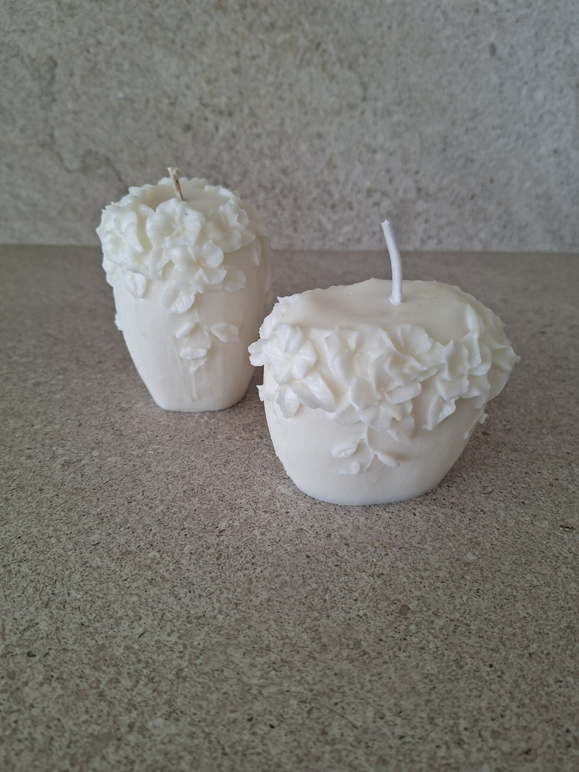 Conjunto de dos velas blancas con flores estriadas, una alta y otra más baja, aroma a vainilla